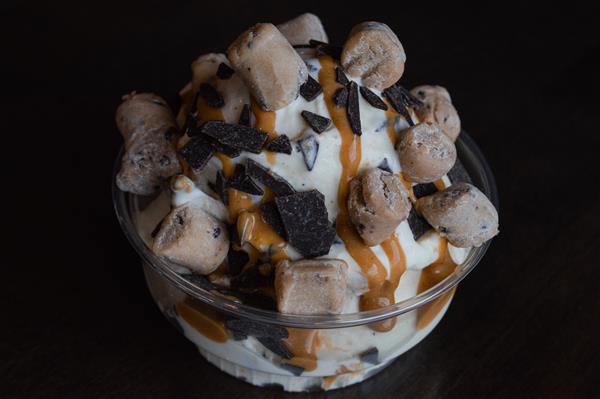 Vanilla frozen custard, Oreo cookie pieces, chocolate chip cookie dough chunks, hard-shell chocolate